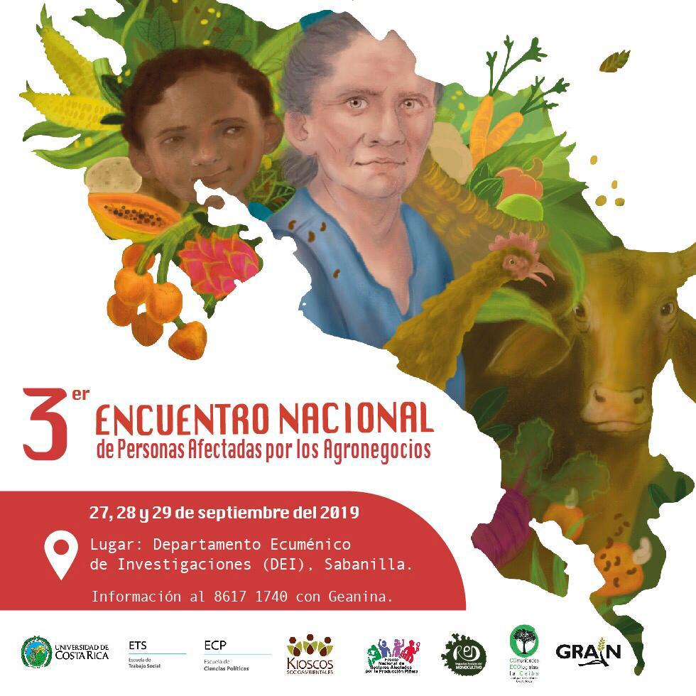 El III Encuentro Nacional de Personas Afectadas por los Agronegocios es una actividad organizada por las Escuelas de Trabajo Social y de Ciencias Políticas de la Universidad de Costa Rica (UCR), la Red Social de Monocultivos, el Programa Kioscos Socioambientales, el Frente Nacional de Sectores Afectados por la Producción Piñera (FRENASAPP), la Red de Coordinación en Biodiversidad (RCB) y Coecoceiba.
