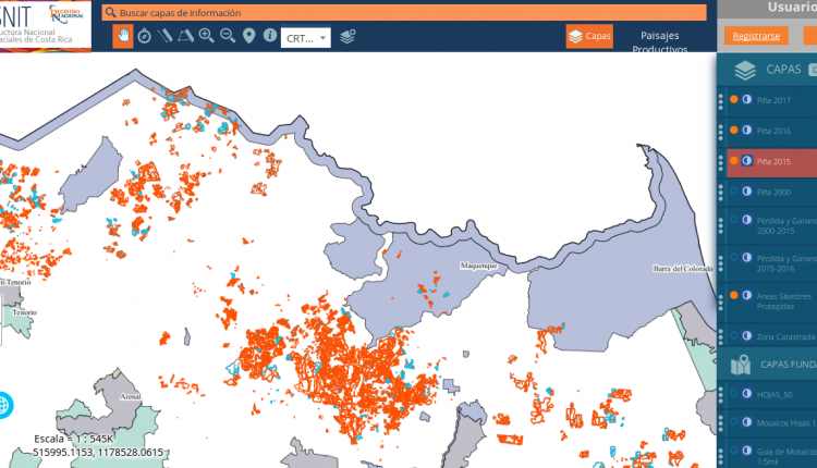 (FECON, 14-01-2019.) Una actualización de mapas satelitales vinculados con la N.A.S.A revelan que existen 66.266 hectáreas de piña sembrada para el año 2017. Según mostraron las imágenes satelitales del Monitoreo de Cambio de Uso en Paisajes Productivos (MOCUPP) de Costa Rica, elaborado por el Laboratorio PRIAS del Centro Nacional de Alta Tecnología (CENAT) del CONARE. (disponibles en el sitio: http://www.snitcr.go.cr/)