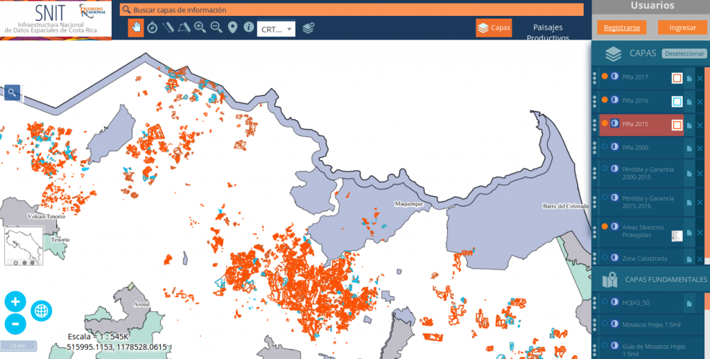 Evidencia científica revela que existen 1.482 hectáreas de piña sembradas dentro de Áreas Silvestres Protegidas. En 2017 se registran 66.266 hectáreas de piña sembradas en el país. Entre 2016-2017 el monocultivo de piña creció unas 9.000 hectáreas sin controles estatales. (FECON, 14-01-2019.) Una actualización de mapas satelitales vinculados con la N.A.S.A revelan que existen 66.266 … Sigue leyendo Nuevas imágenes satelitales comprueban que piña se expande de forma descontrolada